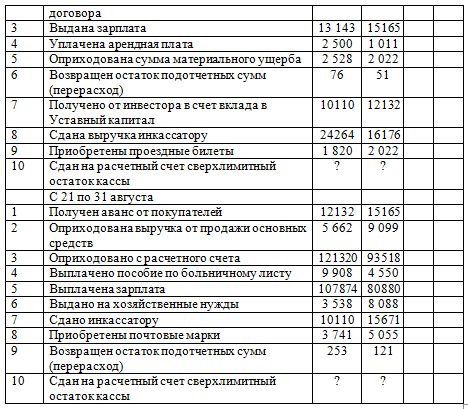 Практическая работа № 1 Синтетический учет кассовых операций Задание 1. Заполнить журнал хозяйственных операций по учету денежной наличности за август. Присвоить дату, исходя из рабочего календаря на текущий год. Лимит остатка средств по кассе установлен в размере 2 500 руб. Исходные данные Остаток денежных средств в кассе на 01 августа составил: 1 вариант - 2 224 руб.; 2 вариант - 2 325 руб.