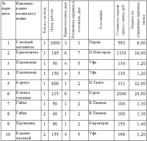 Тема контрольной работы: «Разработка логистической системы управления запасами, комплектующих изделий в организации». В методических указаниях приводится задание на выполнение проекта по вариантам (таблица 1), а также порядок выполнения этого задания. Таблица 1 – Задание на контрольную работу по вариантам: Сведения о комплектующих узлах и деталях, поставляемых по межзаводской кооперации