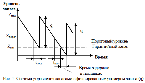 *Примечание. Размер заказа следует округлять до сотен штук в бóльшую сторону. Размер заказа рассчитывается по следующей формуле: qз = Zmax – Zфакт + Zпотр (2) где qз – размер заказа, шт.; Zmax – максимальный желательный запас, шт.; Zфакт – фактический уровень запасов на момент проверки, шт.; Zпотр – ожидаемое потребление за время поставки, шт.