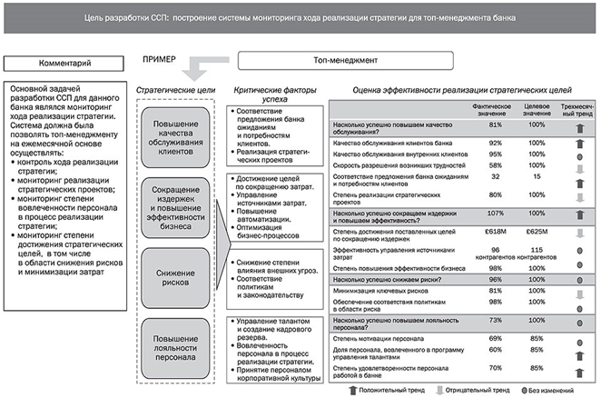 Рисунок 1. Пример СПП банка Справочный материал для выполнения задания: Сбалансированная система показателей (Balanced Scorecard) — это система стратегического управления и оценки, связывающая цели и всеобъемлющие показатели. Она призвана дополнить традиционную систему финансовых показателей недостающими компонентами в целях организации более полной и всесторонней оценки деятельности компании. Основная идея сбалансированной системы показателей (ССП) заключается не только в оценке финансовых активов по результатам отчетного периода (прошлого), но и в предоставлении механизмов оценки перспектив (возможного будущего). Цели и показатели этой системы формируются в зависимости от видения и стратегии организации и рассматривают деятельность компании сквозь призму четырех проекций: · проекция финансов – отвечает на вопрос, каким желают видеть предприятие собственники; · проекция клиентов – отвечает на вопрос, каким должны воспринимать предприятие и его продукт потребители; · проекция бизнес-процессов – отвечает на вопрос, какими темпами совершенствуются стратегически важные процессы; · проекция обучения и развития – отвечает на вопрос, как обеспечивается поддержание уровня квалификации, каковы темпы разработки товаров завтрашнего дня. Связующим элементом между приведенными выше четырьмя компонентами (направлениями) ССП выступают причинно-следственные связи, которые показывают, как один из компонентов влияет на успешное функционирование другого. Например, плохо обученный персонал не сможет эффективно выполнять свои обязанности, тем самым даже оптимально выстроенный бизнес-процесс не будет давать требуемого результата. Перед каждым из четырех направлений стоят определенные цели, достижение которых приведет организацию к желаемому состоянию. При формулировании цели нужно придерживаться следующих принципов: 1) конкретность и четкость цели; 2) измеряемость; 3) реальность; 4) временные рамки. Финансовые показатели позволяют оценить экономический эффект от деятельности компании за предыдущий период. Обычно финансовыми целями организации является прибыль, которая может измеряться в виде дохода от займа, операционной прибылью и добавленной стоимостью продукции или услуг. Кроме того, в качестве финансовых целей может выступать объем продаж. В качестве примера можно привести следующие финансовые показатели: 1. группа показателей роста дохода и масштаба деятельности: · показатель объема продаж; · доля дохода от продаж нового продукта; · прибыльность продукта или клиента; · доля неприбыльных клиентов и т.д.; 2. группа показателей, идентифицирующих сокращение издержек: · отношение получаемого дохода к имеющемуся персоналу; · сокращение издержек; · сравнение собственных издержек с издержками фирм-конкурентов; · себестоимость продукта, услуги и т.д.; 3. группа показателей эффективности использования активов: · окупаемость вложений; · коэффициент ликвидности оборотного капитала; · коэффициент использования основных активов; · процент продаж новых продуктов и т.д. Показатели клиентской составляющей позволяют сформулировать стратегию, ориентированную на потенциальных потребителей и клиентов, которая обеспечит желаемый доход компании. К таким показателям можно отнести: • удовлетворение потребностей клиентов; • сохране