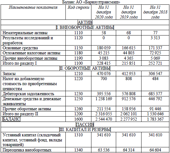 Задание к кейсу: 1. Ознакомьтесь с ситуацией и определите основные виды экономических и финансовых рисков, присущих деятельности компании 2. Оцените уровень риска платежеспособности по данным бухгалтерской отчетности (представьте расчеты, заполните таблицу) 3. Определите отрицательное влияние выявленных экономических и финансовых рисков на деятельность компании и разработайте мероприятия, направленные на их минимизацию, выбрав наиболее оптимальные методы управления ими (результаты оформите в Таблицу) Экономические и финансовые риски, оказывающие влияние на деятельность АО «Барнаултрансмаш»