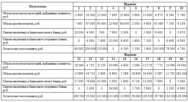 Варианты задания № 2 Условия задачи П. П. Петров является обладателем дебетовой карты, которая имеет следующие характеристики: 1) комиссия за снятие наличных в банкомате своего банка – 0% от суммы снятия; 2) комиссия за снятие наличных в банкомате стороннего банка – 3% от полученной суммы; 3) начисляется повышенный кешбэк с пяти категорий покупок, выбранных держателем карты – 8%; 4) начисляется 5% годовых на остаток денежных средств до 200 000 руб. (включительно); 5) начисляется кешбэк на все остальные категории покупок в размере 2%. Определите полученную выгоду за месяц при использовании указанной карты с кешбэком, если П. П. Петров в течение месяца совершал следующие операции по карте (см. таблицу). Варианты исходных данных для контрольной работы