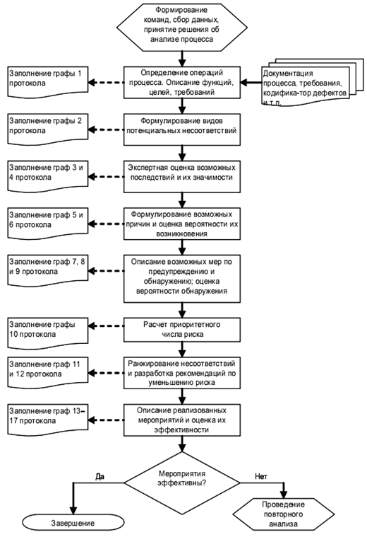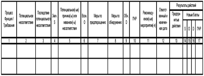 РАЗРАБОТКА РЕКОМЕНДАЦИЙ ПО СНИЖЕНИЮ РИСКА Для всех причин, имеющих значение ПЧР ≥ ПЧРгр, разрабатывают рекомендации, направленные на снижение риска до приемлемого уровня. Формулируются конкретные меры устранения выявленных потенциальных несоответствий и/или их причин, направленные на снижение показателей O, D и, соответственно, ПЧР. Предварительно по каждой причине проводится анализ и оценка возникновения и обнаружения и рассчитывается планируемое значение ПЧР. Разработанные рекомендации с указанием ответственных за исполнение и сроков заносят в графы 11 и 12 протокола анализа (рисунок 2). ОЦЕНКА ЭФФЕКТИВНОСТИ ЗАПЛАНИРОВАННЫХ МЕРОПРИЯТИЙ После выполнения запланированных мероприятий команда экспертов проводит повторный анализ, выполняя оценку значимости, возникновения и обнаружения для каждой причины и рассчитывая новое значение ПЧР с учетом проведенных работ. Новые значения S, O, D и ПЧР заносятся в графы 14–17 протокола анализа. В том случае, если все запланированные мероприятия будут внедрены и эффект корректирующих/предупреждающих действий адекватен поставленным при их разработке целям, процедура будет считаться завершенной. В противном случае принимается решение о проведении повторного FMEA-анализа процесса и разработке новых рекомендуемых мероприятий. Задание 1. Проанализировать приведенные общие положения. 2. Предложить объекта анализа 3. Разработайте шкалы для оценка возникновения и обнаружения возможных причин и расчёт ПЧР. Оцените риск 4. Разработайте рекомендации по снижению риска | |||||||||||||||||||||||||||||||||||||||||||||||||||||||||||||||||||||||||||||||||||||||||||||||||||||||||||||||||||||||||||||||||||||||||||||||||||||||||||||||||||||||||||||||||||||||||||||||||||||||||||||||||||||||||||||||||||||||||||||||||||||||||||||||||||||||||||||||||||||||||||||||||||||||||||||||||||||||||||||||||||||||||||||||||||||||||||||||||||||||||||||||||||||||||||||||||||||||||||||||||||||||||||||||||||