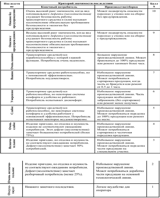 ОЦЕНККА ЗНАЧИМОСТИ ПОТЕНЦИАЛЬНЫХ НЕСООТВЕТСТВИЙ Для каждого последствия анализируемого несоответствия эксперты оценивают его значимость S. Это значение указывается в графе 4 протокола Оценка зависит от тяжести последствий несоответствия и определяется с помощью 10-балльной шкалы (Таблица 2). Таблица 2 Типовая шкала баллов значимости S при PFMEA
