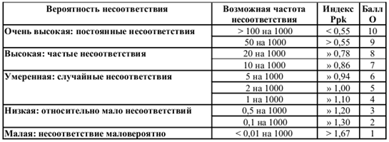 ОЦЕНКА ВОЗНИКНОВЕНИЯ И ОБНАРУЖЕНИЯ ВОЗМОЖНЫХ ПРИЧИН И РАСЧЁТ ПЧР Для каждой причины потенциального несоответствия с помощью соответствующей типовой шкалы (таблица 3, таблица 4) необходимо определить ранги возникновения O и обнаружения D, Ранги возникновения и обнаружения, выставленные по 10-балльной шкале, заносятся в протокол анализа, в графы 6 и 9 соответственно (рис 2). ПЧР (приоритетное число риска) рассчитывается для каждой причины потенциального несоответствия как произведение рангов значимости, возникновения и обнаружения. Результат заносится в протокол FMEA в графу 10 (рисунок 2). Таблица 3 Типовая шкала баллов возникновения О при PFMEA