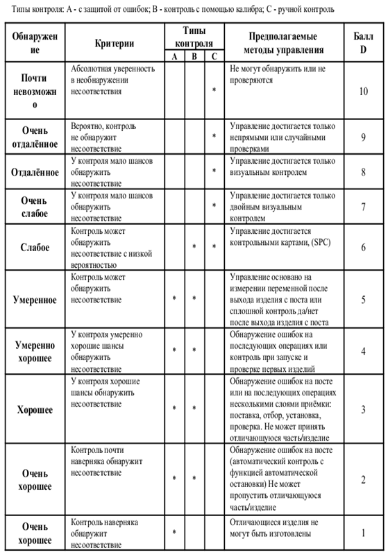 РАНЖИРОВАНИЕ ПРИЧИН ПОТЕНЦИАЛЬНЫХ НЕСООТВЕТСТВИЙ Чтобы выделить среди причин потенциальных несоответствий те, которые обязательно должны быть устранены (наиболее рисковые), производят ранжирование причин (например, с использованием диаграммы Парето). Следует определить, какие виды несоответствий требуют доработки процесса в первую очередь (несоответствия с максимальным ПЧР). Также необходимо уделить внимание видам несоответствий, значимость последствий которых велика (ранг значимости составляет 9 или 10, то есть данные несоответствия влияют на безопасность). Чтобы выделить причины потенциальных несоответствий, риск которых основан не только на высокой значимости последствия, но и на высокой частоте возникновения, причины можно ранжировать по произведению рангов значимости и возникновения (S∙O). Таблица 4 Типовая шкала баллов обнаружения D при FMEA