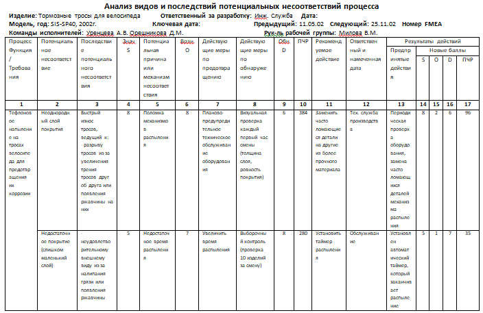 Рисунок 1 Схема анализа видов и последствий потенциальных несоответствий процесс. Ниже приведен пример протокола PFMEA (рисунок 2). Анализ видов и последствий потенциальных несоответствий процесса Изделие: Тормозные тросы для велосипеда Ответственный за разработку: Инж. Служба Дата: Модель, год: SIS-SP40, 2002г. Ключевая дата: Предыдущий: 11.05.02 Следующий: 25.11.02 Номер FMEA Команды исполнителей: Уренцева А.В. Орешникова Д.М. Рук-ль рабочей группы: Милова В.М.