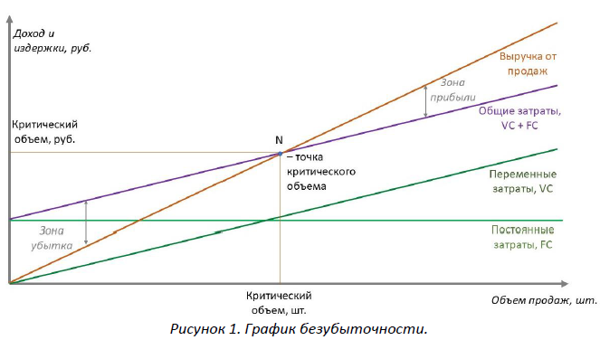 Методические рекомендации для анализа ситуации Для структурированного анализа проблемных ситуаций компаний необходимо различать следующие этапы в процессе разработки и принятия управленческих решений: 1) целеполагание; 2) анализ проблем; 3) поиск альтернативных решений; 4) прогнозирование последствий принятия тех или иных решений; 5) оценка результатов. На этапе «Целеполагание» определяются приоритетные цели компании и показатели измерения их достижения / недостижения. Как правило, для коммерческих компаний приоритетные цели связаны с ростом продаж, выручки и прибыли. Индикаторами данных целей являются финансовые показатели. Поэтому на данном этапе следует выявить, какие цели компания определяет как приоритетные, а какие второстепенные, и сравнить финансовые показатели, отражающие достижение целей, в периодах (вчера / сегодня). Этап «Анализ проблем» включает в себя не констатацию проблемы (это выявляется на первом этапе: недостижение приоритетных целей – это проблема), а анализ ее причин, анализ ситуаций, приведших к имеющимся результатам. Для качественного исследования причин необходимо рассматривать ситуации в разрезе продуктов и рынков компании. Это важно, поскольку конкурентная ситуация, а следовательно, и ценовая политика компании на разных рынках с разными продуктами может отличаться. Обострение конкуренции сокращает доли рынка слабых компаний в пользу сильных, что в свою очередь, приводит к снижению объемов продаж и прибыли у первых. Взаимосвязь показателей затрат и объема продаж принято иллюстрировать на графике безубыточности (рис. 1), а исследование зависимости показателей называют CVP – анализом (Costs – Volume - Profit) или анализом «затраты-объем-прибыль».