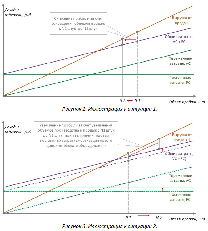 Расшифровка обозначений на графике и некоторые пояснения. FC (fixed cost) – постоянные затраты – это затраты, которые не могут существенно изменены даже на короткое время без фундаментальных изменений в организации деятельности компании. Такими изменениями могут быть: расширение / сокращение производственных и офисных площадей, увеличение / сокращение / замена производственных мощностей, сокращение / увеличение персонала и другие мероприятия, которые отражаются в затратах общепроизводственного характера. VC (variable cost) – переменные затраты – затраты, меняющиеся прямо пропорционально количеству производимой продукции. К таким затратам всегда относятся затраты на сырье, материалы и компоненты, входящие в состав изделия. Эти затраты включаются в себестоимость продукции прямым счетом исходя из расхода сырья и материалов, и количества входящих в изделие покупных компонентов. Изменение этих затрат на единицу продукции возможно при изменении технологии изготовления, стоимости покупаемого сырья, материалов и компонентов. К переменным затратам так же следует относить заработную плату работников, чей заработок начисляется по сдельной форме оплаты труда. В этом случае, в себестоимость единицы продукции включаются расценки по операциям, выполняемым в процессе изготовления изделия. Изменение сдельных расценок возможно при изменении трудоемкости операций (за счет введения нового более производительного оборудования или упрощения / усложнения технологического процесса), квалификации привлекаемых на операции рабочих (привлечение более квалифицированных рабочих на операции не требующих высокой квалификации влечет увеличение расценок за труд), сверхурочная работа, работа в выходные дни и др. Рассмотрим некоторые ситуации и изменение финансовых показателей с помощью данного графика. Ситуация 1 – снижение объемов продаж (рис. 2). Предположим, компания имела за предыдущий год объем продаж 1000 шт., в текущем году при прочих равных условиях ожидаемый объем продаж снизится до 800 шт. Цена единицы продукции 500 руб. Постоянные затраты компании 300 000 руб. в год, переменные затраты на единицу продукции 100 руб. Таким образом, в предыдущем году: - выручка компании составила 500 000 руб. - постоянные затраты: 300 000 руб. - переменные затраты: 100 000 руб. - прибыль: 100 000 руб. В текущем году ожидается: - выручка: 400 000 руб. - постоянные затраты: 300 000 руб. - переменные затраты: 80 000 руб. - прибыль: 20 000 руб. Ситуация 2 –увеличения объемов производства за счет покупки нового оборудования для обеспечения ожидаемого роста продаж. Предположим, что компания ожидает увеличение продаж в текущем году на 500 шт. по сравнению с предыдущим и для повышения объемов производства приобрела оборудование, годовая амортизация которого приведет к увеличению годовых постоянных затрат на 100 000 руб. Таким образом (при начальных условиях из ситуации 1) по итогам текущего года: - выручка компании составит 750 000 руб. - постоянные затраты: 400 000 руб. - переменные затраты: 150 000 руб. - прибыль: 200 000 руб.