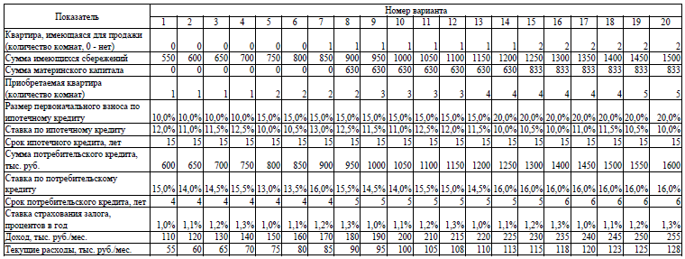 Порядок выполнения расчетно-аналитической части Расчетно-аналитическая часть заключается в составлении финансового плана по приобретению квартиры с использованием ипотечного кредита. Этапы выполнения расчетно-аналитической части: 1) расчет параметров финансового плана в соответствии с установленным вариантом; 2) корректировка расчета для оптимизации сроков финансового плана; 3) расчет в соответствии с актуальными параметрами (действующие ставки кредитования), уровень заработной платы, индивидуальные планы по улучшению жилищных условий. По результатам расчета делается вывод о возможности использования ипотечного кредитования в существующих экономических условиях. Расчеты производятся с использованием табличного процессора (MS Excel, Open Office Calc). Напомним правила заполнения электронных таблиц: исходные данные должны вводиться в таблицу только один раз (блок «Исходные данные». Дальнейшее включение их в расчеты проводится с использованием ссылок на соответствующие ячейки. Это обеспечивает быстрый пересчет результатов при изменении входных параметров, дает возможность подбора оптимального варианта при вводимых в расчет корректировках. Выбор варианта задания для первого этапа расчета производится в соответствии с порядковым номером обучающегося в списке учебной группы. При превышении номера значения 20 в качестве варианта принимается остаток от его деления на 20 (например, для студента с номером 32 номером варианта будет 12). Варианты исходных данных приведены в Приложении Б. Все исходные данные и результаты расчета представляются в тысячах рублей.