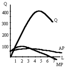 а) когда начинается убывающая отдача труда? б) если бы фирма хотела сохранить средний продукт (АР) максимальным, то сколько рабочих она стала бы нанимать? в) представьте, что сейчас у фирмы АРL = MPL. Если бы вы были одним из нескольких новых рабочих, которых фирма собирается принять на работу, то вы предпочли бы: 1) чтобы вам платили стоимость вашего среднего продукта; 2) или стоимость вашего предельного продукта? г) если владелец фирмы сказал рабочему, который ищет работу, что он не нанял бы еще одного рабочего, даже если тот согласится работать бесплатно, то мы вправе предположить, что: 1) средний продукт рабочих = 0; 2) средний продукт рабочих возрастает; 3) средний продукт рабочих отрицательный; 4) средний продукт рабочих понижается. д) Один шутник заметил, что когда известный правительственный деятель переехал из Нью-Йорка в Калифорнию, то средний коэффициент умственного развития в обоих штатах повысился. Почему? Задача 6. На основе диаграммы о средней производительности труда (АР) на фирме ответьте на следующие вопросы: