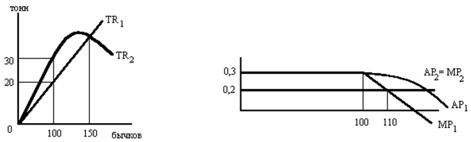 а) если АРL имеет максимум в точке L = 10, то можно ли считать, что общий продукт труда Q также имеет максимум в точке L = 10? б) если МР 15-й единицы труда имеет отрицательное значение, значит ли это, что АРL в этой точке имеет отрицательную величину? в) если АРL = 40 при L = 8, а МР 9-ой единицы труда = 60, то каков общий продукт труда при L = 9? г) чему равен общий продукт фирмы, если АРL = 25? д) при какой численности рабочих АРL = МРL? Задача 7. ООО "Прогресс" имеет 200 молодых бычков, которых нужно распределить по двум пастбищам. Если на 1-е небольшое пастбище направить любое количество бычков, но не более 100, то каждый бычок даст привес 300 кг в год, а если бычков будет свыше 100, то привес каждого будет быстро сокращаться. Качество травы на 2-м пастбище ниже, но пасти здесь можно неограниченное количество бычков и годовой привес каждого составит 200 кг. Соответствующие кривые общей продукции с двух пастбищ показаны на графике. Имея эти данные, нужно наилучшим способом распределить стадо бычков по двум пастбищам.