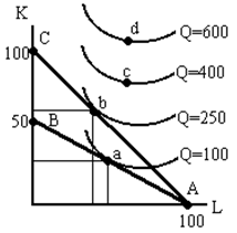 Ответьте на вопросы: а) Какова первоначальная цена капитала? б) Какова первоначальная цена труда? в) Какова новая цена капитала? г) В какой точке фирма первоначально находится в состоянии равновесия? д) Какова новая точка равновесия? е) Напишите уравнения для изокосты АВ и для изокосты АС. ж) Каковы относительные значения МРК и МРL в точке “b”? Почему? з) Каковы относительные значения МРК и МРL в точке “а”? Почему? и) Может ли фирма находиться в точке “с”? В каком случае точка “с” окажется достижимой? к) Определите наклон линий АВ и АС. л) Как можно выразить наклон изокванты Q = 100 в точке “а”?