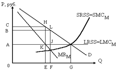 а) изобразите на графике кривые спроса, предельного дохода, предельных издержек и средних общих издержек; б) определите: – объём выпуска ______ – цену фирмы ______ – сумму прибыли ______ в) Каким образом ответы на вопросы в пункте б) можно получить с помощью таблицы, составленной по исходным данным? Задача 5. Кривая спроса монополии может быть выражена как Р = 3000 – 100 Q. Монополия имеет общие постоянные издержки ТFС = 1000 руб. и предельные издержки МС = 200 руб. а) каким будет уравнение общих издержек? б) предельных издержек? в) совокупного дохода (выручки от реализации)? г) предельного дохода? д) каким будет выпуск продукции при максимизации прибыли? Задача 6. Единственная фирма установила монопольную власть над всей ранее конкурентной отраслью. В результате кривая долгосрочного предложения отрасли (LRSS) становится кривой долгосрочных предельных издержек монополии (LMCM), а кривая краткосрочного предложения отрасли (SRSS) –кривой краткосрочных МС монополии (SMCМ). Эта ситуация изображена на рисунке: