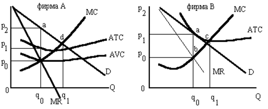 В соответствии с графиком объясните: а) В чем причина несовпадения между АТС и МС? б) Чем является разность между количеством товара, равного 4500 литров, и количеством 3000 литров, выпускаемом в долгосрочном периоде? в) Чему равна избыточная мощность, которая в долгосрочном плане равновесия не используется фирмой? г) Что означает избыточная мощность при монополистической конкуренции? д) Почему экономия ресурсов, которая должна обеспечивать снижение АТС, несовместима с дифференциацией продукта? Задача 11. Два графика демонстрируют положение двух фирм на рынке монополистической конкуренции. Используя данную информацию, определите, верны (В) или неверны (Н) следующие утверждения: