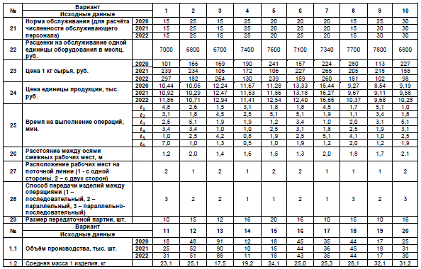 Контрольная (курсовая, расчётно-графическая) работа выполняется в форме кейса. Вариант определяется по порядковому номеру студента в списке группы (или по указанию преподавателя). Контрольная (курсовая, расчётно- графическая) работа должна иметь чёткую структуру и содержать: 1) титульный лист; 2) исходные данные по кейсу 3) теоретико-методические указания с расшифровкой всех применяемых в расчётах формул. 4) практические расчёты в соответствии с вариантом 5) библиографический список. Кейс и исходные данные Определите эффективность использования ресурсов предприятия за период с 2020 по 2022 год. Предприятие как имущественный комплекс существует с 2018 года. За базовый период считать 2020 год. Сборка изделий осуществляется на конвейере. Для характеристики производственного процесса рассчитывается: такт потока; число рабочих мест расчётное и принимаемое на каждой операции и на всей поточной линии; скорость движения заготовок по поточной линии; длину поточной линии. Так же необходимо определить длительность производственного цикла, которая зависит от способа перемещения изделий между операциями, от величины передаточной партии и от величины производственной партии. На предприятии размер производственной партии равен 2000 штук. Для характеристики использования основных производственных фондов применяются различные показатели, которые условно можно разделить на две группы: обобщающие и частные. Поэтому анализ использования основных производственных фондов должен включать анализ изменения таких показателей как фондоотдача, фондоёмкость, фондовооружённость, коэффициенты экстенсивного и интенсивного и интегрального использования оборудования, коэффициент сменности, коэффициент ОЕЕ. Амортизации подлежат: здания и сооружения, машины и оборудование, транспортные средства, инструмент и инвентарь. Новое основные средства относятся к машинам и оборудованию. Способ амортизации оборудования указан в таблице с исходными данными. Повышение эффективности использования оборотных средств означает высвобождение денежных ресурсов. Поэтому для оценки уровня использования оборотных средств необходимо проанализировать следующие показатели эффективности их использования: удельная материалоёмкость, коэффициент оборачиваемости (скорость оборота), длительность одного оборота, абсолютное и относительное высвобождение денежных средств. Кадры имеют качественную, количественную и структурную характеристику. Количественная характеристика персонала определяется следующими показателями, которые необходимо рассчитать: сменная численность, явочная численность, штатная численность, средняя списочная численность, темпы роста, прироста численности персонала. Численность персонала рассчитывается исходя из технологической трудоёмкости. Длительность рабочей смены составляет 8 часов. Эффективность использования трудовых ресурсов предприятия характеризует производительность труда. Производительность труда измеряется двумя показателями, которые необходимо рассчитать: выработку и трудоёмкость. Система оплаты труда в любой организации должна поощрять производительность, творчество, исполнительность и инициативу работников, все те качества, которые приводят к эффективному труду и достижению стратегических целей организации. С