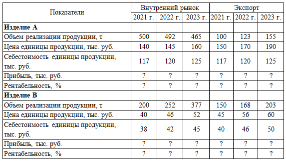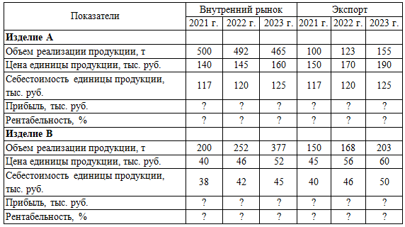 ВАРИАНТ 3 Задание № 1. Определите, какую цену необходимо установить для получения прибыли в размере 38 млн. руб. Планируется реализация единиц продукции - 4000 шт. Постоянные затраты на весь объем производства -58 млн. руб. Переменные затраты в единице продукции - 15 тыс. руб. Задание № 2. На основании приведенных данных изучите динамику структуры рынков сбыта и уровня их доходности по каждому виду продукции. Постройте кривую жизненного цикла изделий. Сделайте выводы по результатам анализа.
