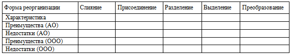 ВАРИАНТ 7 Задание № 1. Реорганизация представляет собой такое изменение юридического лица, при котором все права и обязанности или их часть переходят к другому юридическому лицу, образованному в процессе реорганизации. Реорганизация юридического лица в соответствии со статьей 57 ГК РФ осуществляется в следующих формах: слияние, присоединение, разделение, выделение, преобразование. Заполните ниже приведенную таблицу определив преимущества и недостатки различных форм реорганизации юридического лица для акционерного общества и общества с ограниченной ответственностью. Приведите примеры реорганизации известных российских компаний. Выделите и дайте характеристику факторам, которые оказывают наибольшее влияние на процесс реорганизации фирмы. Таблица 1