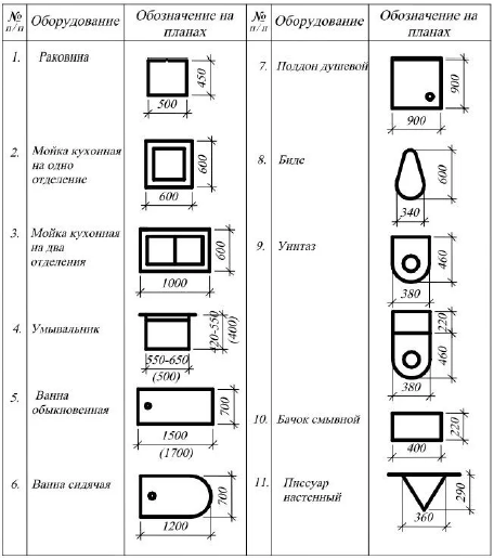 Рис. 3.2. Условные обозначения санитарно-бытовых устройств Контрольные вопросы и задания 1. Какова роль санитарно-бытовых помещений на производстве? 2. Как проводится экспертиза санитарно-бытовых помещений? 3. Перечислите нормативные документы, которыми руководствуются при проведении экспертизы санитарно-бытовых помещений.
