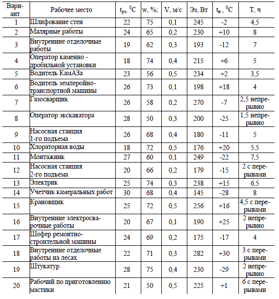 ПРАКТИЧЕСКИЕ ЗАДАНИЯ Задача 1. Оценить микроклимат в помещении Оценить соответствуют ли параметры микроклимата на рабочем месте требованиям СанПиН 2.2.4.548-96 (прил. Б), если фактические параметры соответственно равны: температура рабочей зоны – tрз, оС; относительная влажность – w, %; скорость движения воздуха – V, м/с; энергозатраты на выполнение работ – Эз, Вт; температура наружного воздуха – tн., оС; продолжительность пребывания на рабочем месте Т, в часах. Предложить мероприятия по обеспечению здоровых и безопасных условий труда. Варианты исходных данных для выполнения задачи даны в табл. 4. Таблица 4. Варианты исходных данных