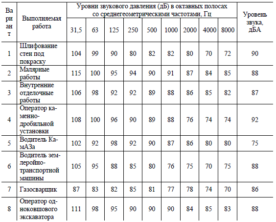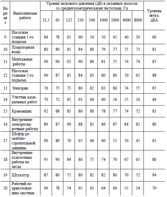 Задача 2. Оценить параметры шума Фактические параметры шума по вариантам приведены в табл. 7. Определить требуемое снижение шума и установить класс условий труда, и эффективность используемых средств защиты, если известно, что после проведения мероприятий по снижению шума уровни звукового давления стали равны данным в табл. 6. Таблица 6. Уровни звукового давления после проведения мероприятий