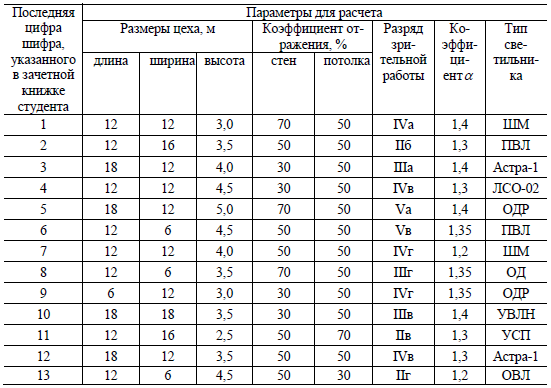 Задача 4. Расчет искусственного освещения Произвести расчет общего искусственного освещения методом коэффициента использования светового потока в производственном цехе. Исходные данные для расчета принять по варианту (табл. 13), номер которого совпадает с последней цифрой шифра, указанного в зачетной книжке студента. Таблица 13. Варианты исходных данных