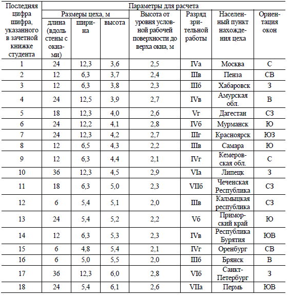 Задача 5. Расчет естественного освещения Рассчитать площадь световых проемов в цехе для обеспечения нормированного значения коэффициента естественного освещения (КЕО). Для расчета естественного освещения принять боковое расположение световых проемов. Исходные данные для расчета принять по варианту, номер которого совпадает с последней цифрой шифра, указанного в зачетной книжке студента (табл. 14). Таблица 14. Варианты исходных данных