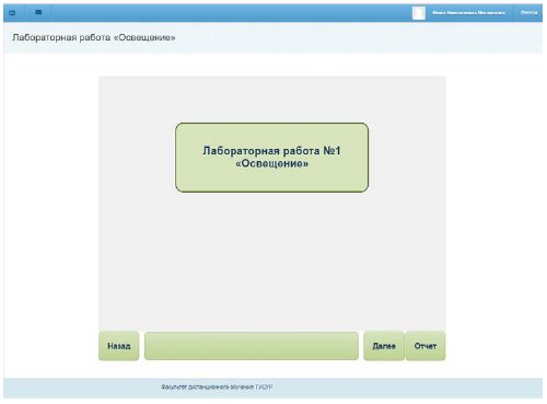 Рис. 1.2 – Титульный лист лабораторной работы № 1 «Освещение» Кнопка «Назад» на титульном слайде не имеет функционального значения, а на последующих позволяет вернуться к предшествующему слайду. Кнопка «Далее» служит для перехода к следующему слайду. Используя кнопку «Отчет», можно с любого слайда перейти к шаблону отчета, чтобы внести полученные данные в таблицы. Для продолжения измерений следует вернуться на исходную страницу с помощью кнопки «Вернуться к эксперименту». Завершение отчета предполагает заполнение всех таблиц и оформление выводов по результатам измерений. После этого отчет следует отправить на проверку с помощью кнопки «Завершить работу». Лабораторная работа состоит из четырех разделов, связанных с исследованием естественного, искусственного, совмещенного и аварийного освещения в производственном помещении.