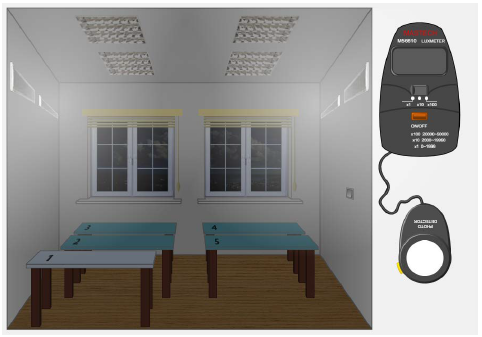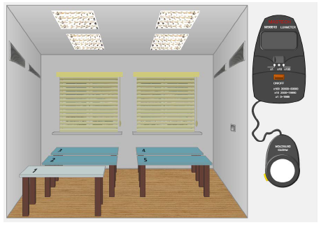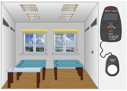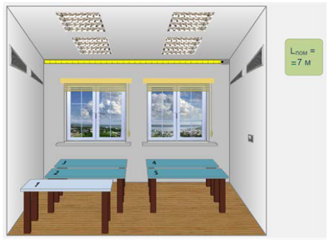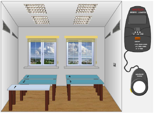 Рис. 1.10 – Виртуальное помещение с искусственным освещением С помощью люксметра последовательно замеряется уровень освещенности на каждом из пяти рабочих мест. Порядок использования люксметра подробно описан в предыдущем разделе. Результаты заносятся в таблицу 2.1 «Результаты измерения уровня освещенности при искусственном освещении» (приложение В). Средний уровень освещенности (Еср) определяется как среднее арифметическое результатов измерения освещенности на пяти рабочих местах и также заносится в таблицу. Минимальные нормированные значения освещенности (Eнорм) производственных помещений для разрядов зрительной работы приведены в приложении Г. Освещенность на рабочих местах (Е) и средняя освещенности в помещении (Еср) сравнивается с минимальным нормированным значением (Eнорм) для IV класса зрительной работы. Значение норматива и выводы о соответствии ему освещенности на рабочих местах и в среднем по помещению заносятся в таблицу 2.1 «Результаты измерения уровня освещенности при искусственном освещении». Сравнивая минимальные нормированные значения с результатами измерений, необходимо сделать вывод о том, каким разрядам зрительных работ соответствует по освещенности каждое рабочее место и помещение в целом. Выводы занести в таблицу 2.1 «Результаты измерения уровня освещенности при искусственном освещении».