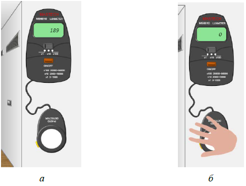 Рис. 1.4 – Включенный люксметр (а) и обнуление показателей (б) Чтобы осуществить новые измерения, необходимо обнулить значение на экране. Для этого служит желтая кнопка, расположенная слева на корпусе фотоэлемента. При нажатии этой кнопки на реальном приборе необходимо закрыть фотоэлемент ладонью, чтобы избежать воздействия световых лучей. Поэтому при подведении курсора к желтой кнопке и нажатии на левую кнопку мыши на экране монитора появляется изображении ладони, закрывающей фотоэлемент (рис. 1.4, б). После того как на экране люксметра появился ноль, можно приступать к измерениям освещенности на рабочих местах (Ев). Для этого следует с помощью мыши последовательно перемещать датчик с фотоэлементом на рабочие места в порядке их нумерации (рис. 1.5). На экране прибора будут появляться значения освещенности, которые надо заносить в таблицу 1.1 «Результаты измерения уровня естественной освещенности» (приложение А), а именно в столбец «Ев, лк». Строки соответствуют номерам рабочих мест. После каждого измерения необходимо обнулять показания прибора.