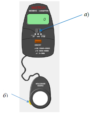 Рис. 1.6 – Подготовка люксметра для измерения наружной освещенности (Ен): а) переключение люксметра в положение х10; б) обнуление результатов люксметра При выполнении лабораторной работы важно помнить, что при необходимости возврата на предыдущие этапы следует выключить люксметр, чтобы можно было воспроизвести начало эксперимента на данном слайде. Затем датчик необходимо поместить на специальную подставку, расположенную в оконном проеме (рис. 1.7).