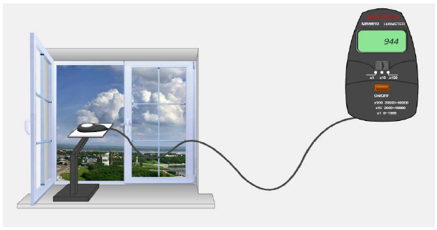 Рис. 1.5 – Измерение освещенности на рабочих местах Кроме измерений освещенности непосредственно на рабочих местах необходимо измерить наружную освещенность. Наружная освещенность – это освещенность, создаваемая небосводом, при экранировании фотоэлемента от прямых солнечных лучей. Следует учитывать, что наружная освещенность подвержена значительным колебаниям в зависимости от сезона, времени суток и погодных условий. Величина наружной освещенности в дневное время зимой может меняться в пределах от 2 до 5 000 люкс, а летом – от 5 до 25 000 люкс. Поэтому в реальных исследованиях естественного освещения для корректности результатов необходимо измерять наружную (Ен) и внутреннюю освещенность (Ев) одновременно. В лабораторной работе измерения проводятся последовательно, что допустимо только в условиях незначительных колебаний наружной освещенности в период измерений. Перед проведением измерений уровня наружной освещенности (Ен) необходимо переключить шкалу люксметра на x10, чтобы прибор не зашкаливал, и обнулить люксметр (рис 1.6)