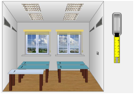 Искусственное освещение Для изучения искусственного освещения необходимо устранить попадание естественного света. Поэтому перед началом измерений в помещении необходимо опустить жалюзи и закрыть оконные проемы. Это делается с помощью щелчка левой клавишей мышки по шнуру, расположенному вдоль правой стороны окна. Затем надо включить искусственное освещение щелчком мыши по выключателю, расположенному на правой боковой стене помещения (рис. 1.10).
