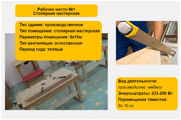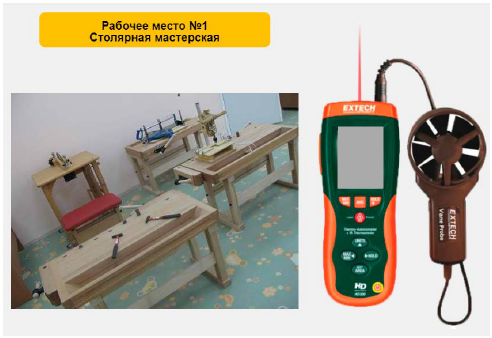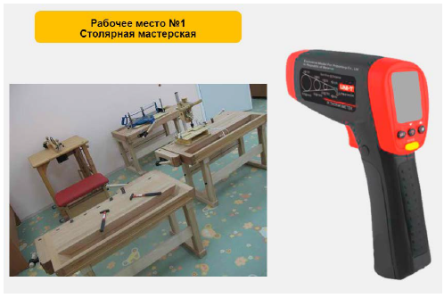 Рис. 2.1 – Слайд с характеристикой рабочего места и вида деятельности На слайде дана информация о рабочем месте столяра. В таблице сразу можно отметить характеристику вентиляции (естественная) и период года (теплый). Сравнивая описания вида деятельности с описаниями категорий работ по уровням энергозатрат (приложение К), можно сделать вывод, что данный вид деятельности относится к категории IIб, поскольку он связан с энергозатратами 233–290 Вт и с перемещением тяжестей до 10 кг. На следующем слайде представлен прибор для бесконтактного измерения температуры: пирометр (рис. 2.2).