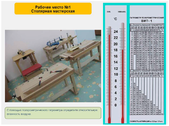 Рис. 2.4 – Измерение относительной влажности воздуха с помощью психрометра Аналогично измеряются показатели температуры, скорости движения воздуха и относительной влажности воздуха для других рабочих мест, представленных на следующих слайдах. Значения параметров микроклимата, полученные для каждого кейса, заносятся в соответствующие графы и столбцы таблицы результатов. Анализ результатов измерений параметров микроклимата на рабочих местах проводится путем сопоставления полученных значений с нормативами оптимальных и допустимых условий труда, при этом учитывается период года (теплый или холодный) и категория работ по уровням энергозатрат. Нормативы содержатся в СанПиН 2.2.4.548-96. Для удобства выполнения лабораторной работы необходимые таблицы с нормативами приведены на слайдах, а также в приложениях (приложения И, К). Делаются выводы о соответствии условий труда на рабочих местах по каждому параметру оптимальным, допустимым или вредным. Выводы заносятся в таблицу 5.1 (приложение Н), в шестую колонку Условия труда по параметру микроклимата (оптимальные, допустимые, вредные). Общий вывод об условиях труда на рабочем месте делается в соответствии с «худшим» параметром микроклимата. Для рабочих мест, на которых условия труда не является оптимальными по параметрам микроклимата, необходимо сформулировать рекомендации по улучшению этих параметров в соответствующий период года. На последних слайдах лабораторной работы приведены методы регулирования параметров микроклимата, которые могут быть использованы для рекомендаций. Рекомендации по оптимизации параметров микроклимата на рабочих местах заносятся в столбец «Рекомендации по улучшению параметров климата» таблицы 5.1.