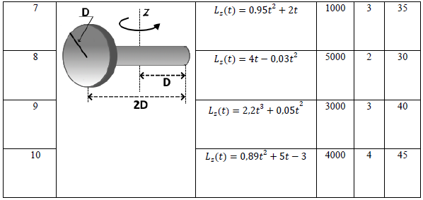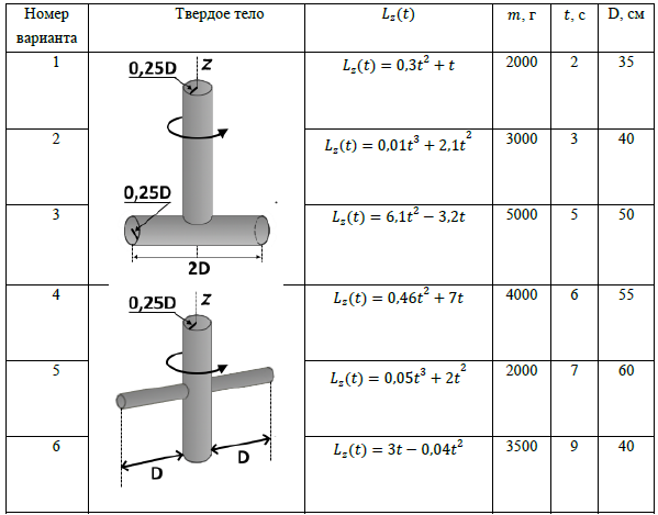 Задача 4. «Динамика вращательного движения». Твердое тело, состоящее из частей различной формы одинаковой массы 𝑚, вращается вокруг неподвижной оси 𝑧. Зависимости проекции момента импульса тела на ось 𝑧 от времени представлена уравнением 𝐿𝑧(𝑡). Для момента времени 𝑡 найти: 1) момент силы 𝑀, действующий на тело; 2) момент инерции системы тел 𝐼𝑧 относительно оси z; 3) модуль углового ускорения тела 𝜀; 4) кинетическую энергию вращательного движения тела 𝐸к; 5) угловое перемещение 𝜑 6) работу 𝐴, совершенную телом. Данные к задаче: