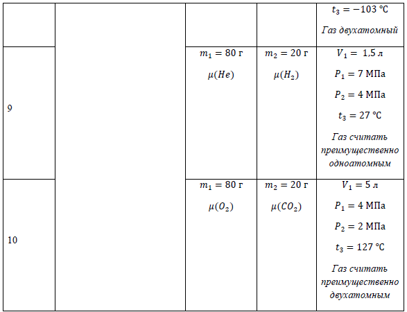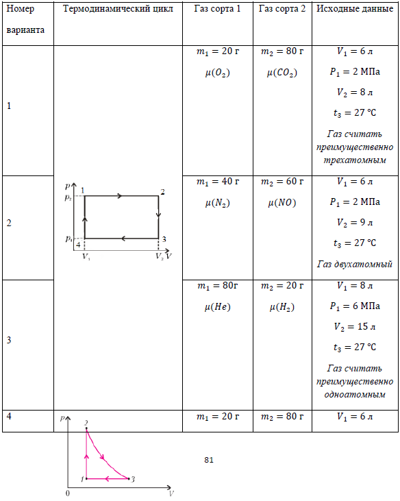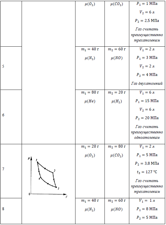 Раздел 2. Молекулярная (статистическая) физика и термодинамика Задача 1. «Термодинамические циклы» Газ сорта 1 массой 𝑚1 и газ сорта 2 массой 𝑚2 находятся в сосуде объемом 𝑉1 под поршнем при температуре 𝑡1 и давлении 𝑃1 (состояние 1). Смесь газов совершила термодинамический цикл, представленный на рисунке. 1) Определить молярную массу смеси газов 𝜇см. 2) Найти среднюю квадратичную 𝑣кв, среднюю арифметическую 𝑣ариф и наиболее вероятную 𝑣в скорости молекул смеси газов в состоянии 1. 3) Определить молярные теплоемкости смеси газов при постоянном давлении С𝑃 и при постоянном объеме С𝑉, а также постоянную Пуассона для адиабатического процесса 𝛾. 4) Найти все основные термодинамические параметры (P, V, T) для каждого состояния в цикле. 5) Для каждого процесса в термодинамическом цикле определить работу 𝐴, изменение внутренней энергии ∆𝑈 и количество теплоты 𝑄 (переданное смеси или отданное смесью). 6) Определить КПД термодинамического цикла 𝜂. 7) Для каждого процесса в термодинамическом цикле определить изменение энтропии ∆𝑆. 8) Схематически начертить термодинамический цикл в координатах (∆S, T) Данные к задаче: