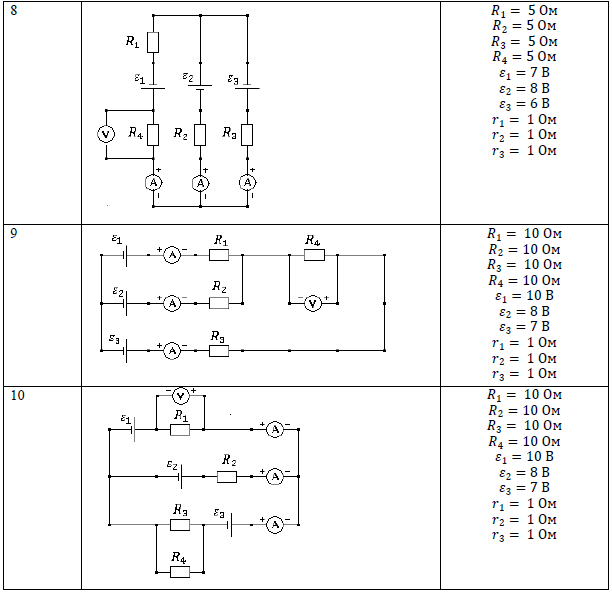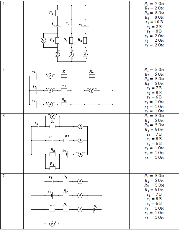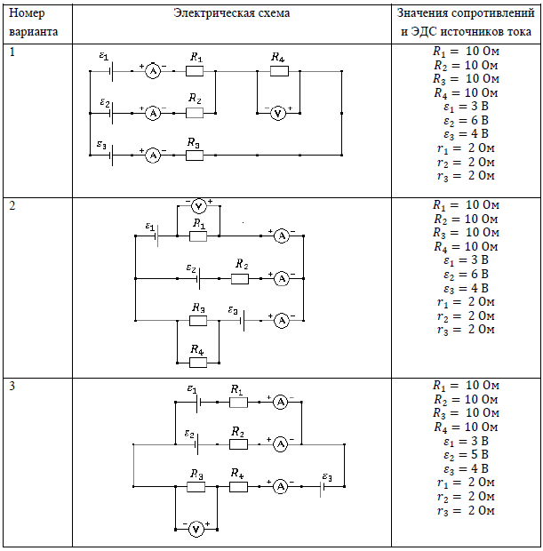 Задача 2. «Электрические цепи» Электрическая схема, значения ЭДС источников тока, внутренние сопротивления, сопротивления резисторов приведены в таблице. Определить: 1) показания амперметров; 2) показания вольтметра; 3) напряжение на зажимах источника тока ε1; 4) мощность, выделяющуюся на сопротивлениях 𝑅2 и 𝑅4; 5) полную мощность источника ε3; 6) количество теплоты, выделившееся на сопротивлении 𝑅1, за 𝑡 = 1 мин; 7) работу электрического тока, проходящего через сопротивление 𝑅2 за время 𝑡 = 1 мин. Данные к задаче: