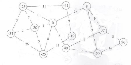 Требуется построить начальный план методами: «северо-западного угла», «минимального элемента», «двойного предпочтения», методом Фогеля. Из каждого плана найти оптимальный план методом потенциалов. Задача 40 Сетевая задача Ниже приведена транспортная задача в сетевой постановке. Каждая задача изображена в виде неориентированного связного графа. На ребрах проставлены значения тарифов cr, на вершинах (в кружках) – значения запасов-потребностей bj. Построить пробный допустимый план, проверить его на оптимальность. В случае необходимости довести до оптимального плана методом потенциалов.