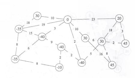 Требуется построить начальный план методами: «северо-западного угла», «минимального элемента», «двойного предпочтения», методом Фогеля. Из каждого плана найти оптимальный план методом потенциалов. Задача 34 Сетевая задача Ниже приведена транспортная задача в сетевой постановке, изображенная в виде неориентированного связного графа. На ребрах проставлены значения тарифов cr, на вершинах (в кружках) – значения запасов-потребностей bj. Построить пробный допустимый план, проверить его на оптимальность. В случае необходимости довести до оптимального плана методом потенциалов.