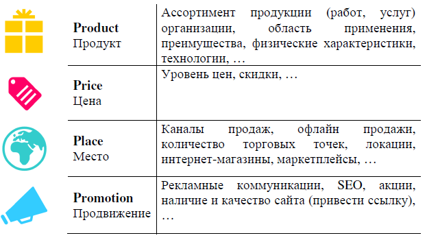 2.2 Конкурентный анализ На первом этапе анализа необходимо определить рыночную нишу организации, выявить и составить список ближайших конкурентов. Проанализировать организацию и каждого конкурента в рамках концепции 4P Таблица 3 – Комплекс маркетинга ООО (АО, ИП, ТОО, …) «Название организации»