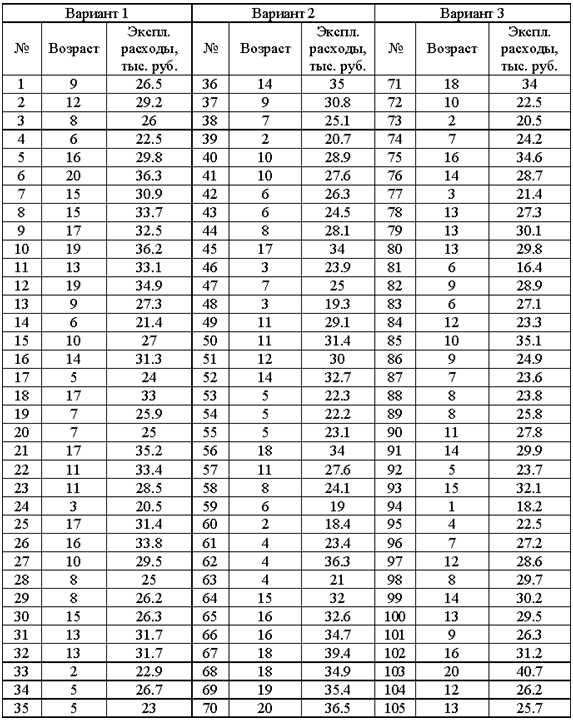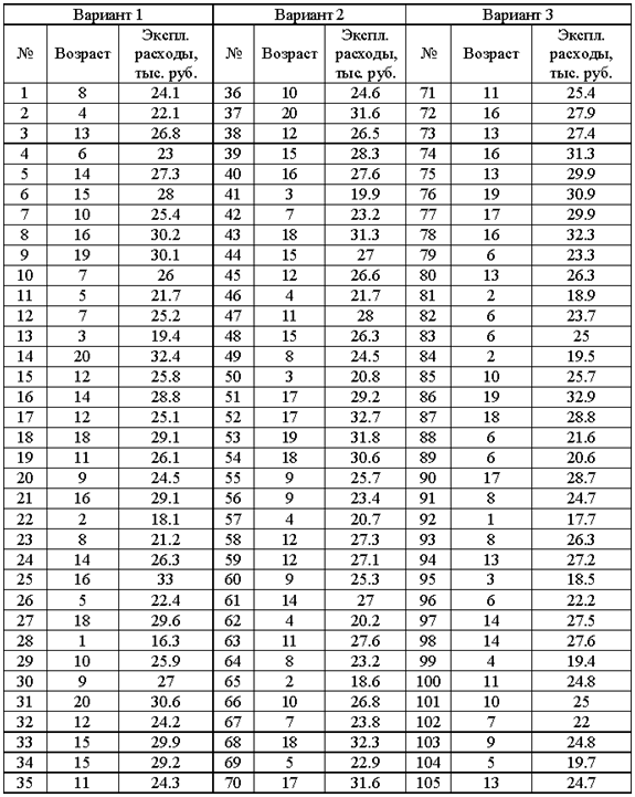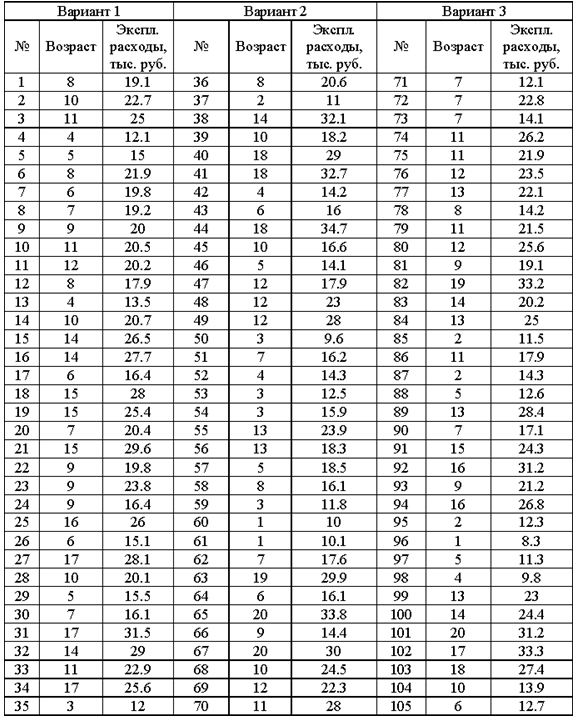 Исходные данные В результате обследования в четырех цехах предприятия станков четырех разных типов, выполняющих одну и ту же операцию, были получены статистические данные о возрасте оборудования и об эксплуатационных расходах, связанных с работой этих станков. Возраст оборудования – целое число. Для станка проработавшего менее одного года полагаем возраст равным 1; для станка, проработавшего от 1 года до 2 лет – 2 года и т.д. Эксплуатационные расходы фиксировались для каждого станка нарастающим итогом с начала года до момента проведения обследования. В результате выполняемой работы предполагалось определить, у какого типа станков наиболее низкие эксплуатационные расходы, как с возрастом станка меняется величина эксплуатационных расходов, с тем чтобы в последующем, при планируемой реорганизации и расширении станочного парка предприятия, произвести замену оборудования наиболее экономичным с точки зрения величины эксплуатационных расходов. Исходные данные для анализа представлены в табл. 1 – 4. Выбор исходных данных Исходные данные выбираются из табл. 1–4. Студент, приступая к выполнению домашней работы, выбирает из каждой таблицы только одну ее часть (один из выбранных вариантов), пользуясь четырехзначным шифром, полученным от преподавателя. Например, студент получил шифр 1231. Это значит, что из табл. 1 для анализа выбирается вариант 1, из табл. 2 – вариант 2, из табл. 3 – вариант 3 и из табл. 4 – вариант 1. Таблица 1