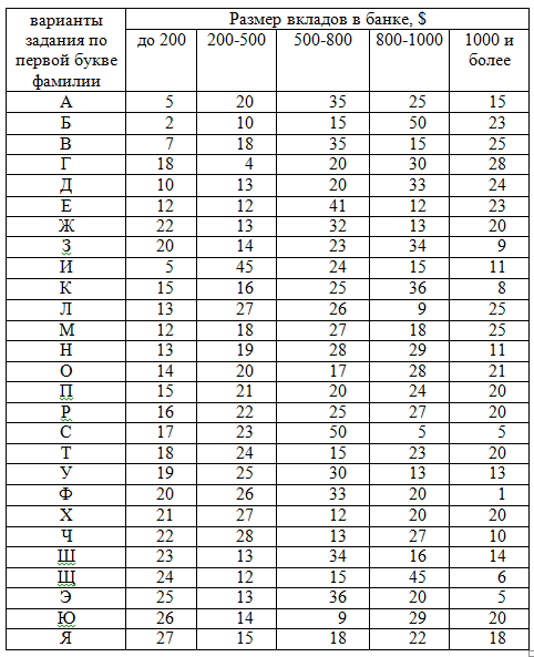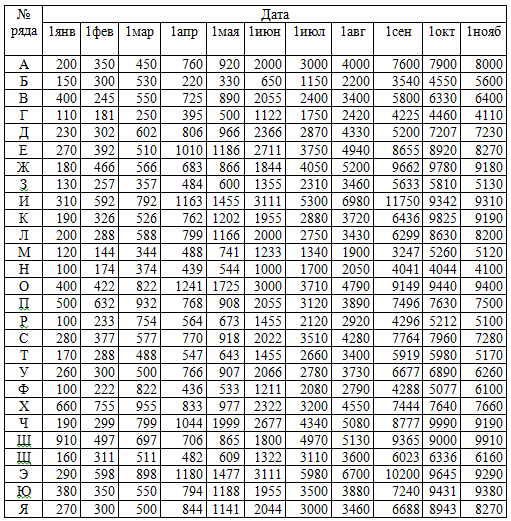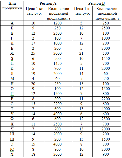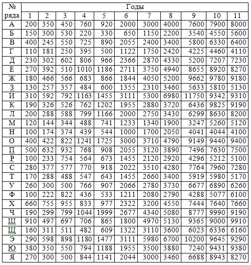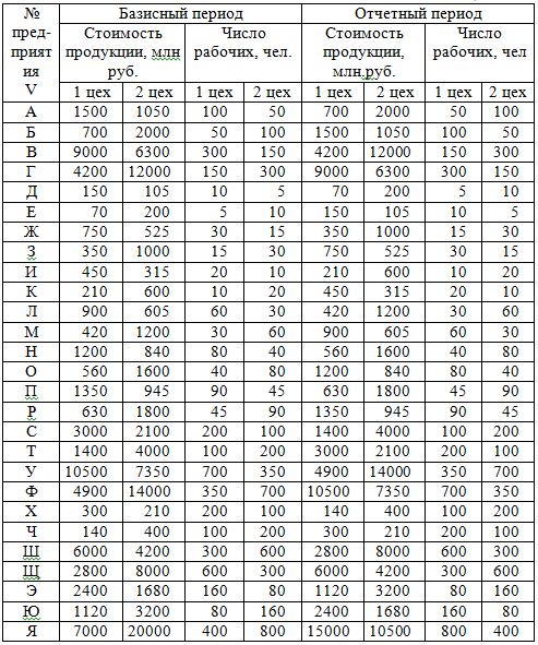 Задание выбирается по первой букве фамилии. Задания для контрольной работы Задание 1 Определить среднеарифметическую, моду и медиану по данным коммерческих банков (табл.1). Моду и медиану рассчитать как графическим, так и расчетным методами. Задание 2 По данным табл.2 и табл.3 определить вид рядов динамики (интервальные или моментные). Согласно первой букве фамилии студента выбрать из табл.2 и табл.3 по одному ряду и рассчитать для каждого ряда средние величины. Задание 3 По данным об индексах потребительских цен на отдельные виды товаров и платных услуг населению, приведенных в % к предыдущему месяцу, вычислить темпы роста цен за последние два года. Для расчета использовать источники статистической информации (журналы “Статистическое обозрение”, “ Вопросы статистике”). Задание 4 По трем видам продукции (V,V+1,V+2, где V- первая буква фамилии, табл.4) определить: - индивидуальные индексы физического объема и цен базисные и цепные, - общие индексы физического объема с постоянными и переменными весами, - влияние изменения цен на динамику производства продукции за три года в абсолютном (тыс. руб.) и относительном выражении (в процентах). Сделать выводы. Задание 5 По данным предприятия, номер которого соответствует первой букве фамилии (табл.5), рассчитать индексы производительности труда: - переменного состава, - индекс постоянного состава, - индекс структурных сдвигов. Сделать выводы. Задание 6 Рассчитать территориальные индексы по исходным данным таблицы 6. Сделать выводы. Задание 7 С вероятностью Р определить возможные пределы изменения средней величины, найденной в первом задании, для генеральной совокупности банков при условии, что данные по банкам получены путем 5%-ного случайного бесповторного отбора. Варианты значений вероятности Р и коэффициентов доверия t приведены в табл.7. Задание 8 Определить, как изменился товарооборот, если цены на продукцию и количество проданных продуктов за отчетный период изменились (см. табл. 8) Таблица 1