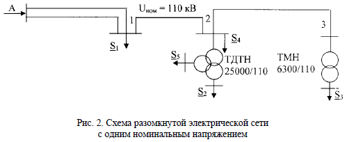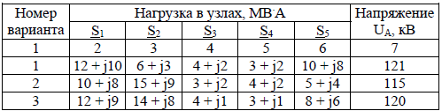 ЗАДАЧИ ПО ТЕМЕ: «РАСЧЕТ РЕЖИМОВ РАЗОМКНУТЫХ ЭЛЕКТРИЧЕСКИХ СЕТЕЙ» Задача № 8 От электрической станции отходит линия электропередачи номинального напряжения Uном = 330 кВ длиной L км, выполненная проводом марки АС. Нагрузка в конце линии – Sк, напряжение в конце линии – Uк. Представить линию П-образной схемой замещения. Определить мощность в начале линии Sн, напряжение в начале линии Uн, потери активной и реактивной мощности в линии, зарядную мощность линии Qb, продольную и поперечную составляющие падения напряжения, модуль полного падения напряжения. Марку провода, числовые значения L, Sк и Uк принять из табл. 11, 12. Результаты расчетов занести в табл. 13. Построить в масштабе векторную диаграмму напряжений. Задача № 9Для линии электропередачи с параметрами из задачи № 8 (см. табл. 11) определить мощность и напряжение в конце линии Sк и Uк, если известны рассчитанные в задаче № 8 мощность и напряжение в начале линии Sн и Uн (см. табл. 13). Определить также потери активной и реактивной мощности, зарядную мощность, продольную и поперечную составляющие падения напряжения и полное падение напряжения. Результаты расчетов занести в табл. 13. Построить в масштабе векторную диаграмму напряжений, совмещенную с векторной диаграммой из задачи № 8. Задача № 10Для линии электропередачи с параметрами из задачи № 8 (см. табл. 11) определить мощность в конце линии Sк, напряжение в начале линии Uн, если известны напряжение в конце линии Uк из табл. 12 и мощность в начале линии Sн, полученная в задаче № 8 (см. табл. 13). Результаты расчета занести в табл. 13. Задача № 11Для линии электропередачи с параметрами из задачи № 8 (см. табл. 11) определить мощность в начале линии Sн и напряжение в конце линии Uк, если известны нагрузка в конце линии Sк из табл. 12 и напряжение в начале линии Uн, полученное в задаче № 8 (см. табл. 13). Результаты расчета занести в табл. 13. Задача № 12От шин узловой подстанции А питается разветвленная электрическая сеть напряжением 110 кВ (рис. 2). Представить каждый участок линии П-образной схемой замещения. Длины участков А-1, 1-2, 2-3, марки их проводов, напряжения на шинах подстанции UA и нагрузки узлов принять из табл. 14, 15 для заданного преподавателем варианта. Коэффициенты трансформации трансформаторов принять: на подстанциях 1,3 n = 115/10,5 кВ; на подстанции 2 n = 115/38,5/11 кВ, полагая, что на подстанции 2 n нагрузка S2 подключена к обмотке низшего напряжения, а нагрузка S5 – к обмотке среднего напряжения трансформатора. Определить потоки мощности в начале и в конце каждого участка сети, потери мощности и падения напряжения в линиях, напряжения в узлах сети, в том числе на вторичных сторонах трансформаторов, с учетом заданных коэффициентов трансформации. Результаты расчетов представить в виде схемы с нанесенными на нее потоками мощности, зарядными мощностями линий в начале и в конце каждого участка и напряжениями во всех узлах, как показано в [3], c. 126.