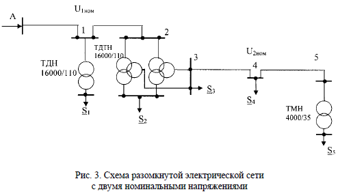 Задача № 13 От шин электрической станции А питается радиальная электрическая сеть с номинальными напряжениями U1ном и U2ном (рис. 3). Представить каждый участок линии соответствующей схемой замещения. Потерями на корону в линиях пренебречь. Нагрузки подстанций, длины участков А-1, 1-2, 3-4, 4-5, марки их проводов, напряжение на шинах станции UA принять из табл. 16, 17 для заданного преподавателем варианта. Коэффициенты трансформации трансформаторов принять: для подстанции 1 n1 = 115/11 кВ, на подстанции 5 n5 = 35/6,3 кВ, на подстанции 2 n2 = 115/38,5/6,6 кВ.