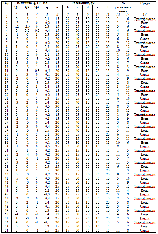 Задания к контрольным работам Контрольная работа выполняется студентами самостоятельно на бумажном носителе (тетрадь формата А5/А4 или альбомные листы белой бумаги формата А4). Вариант задания студент определяет самостоятельно по последним двум цифрам зачетной книжки (студенческого билета) в соответствии с таблицей выбора задания. Задача №1 Три электрических зарядов Q1, Q2, Q3 расположены на одной линии; расстояние между ними b и c. Необходимо найти напряжённость E и потенциал φ электрического поля в указанных цифрами точках и напряжение U между ними, а также силу F, действующую на заряд q, помещенный в указанную в колонках 12 (для четных вариантов) и 13 (для нечетных вариантов) точку, при нахождении зарядов: а) в воздухе; б) в заданной среде (колонка 14). Данные для расчета следует взять из таблицы 1.