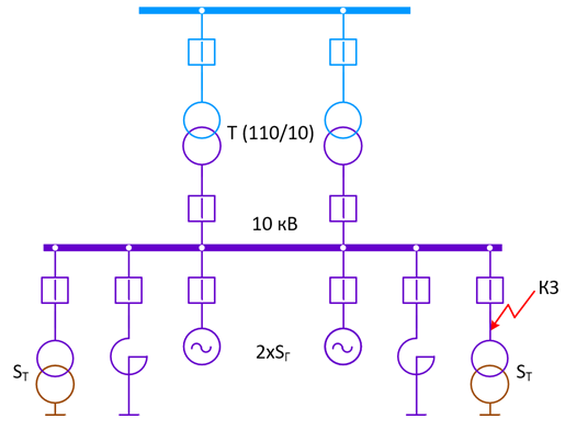 Задание на контрольную работу Задание №1 Выбрать по наибольшему продолжительному току и проверить на термическую стойкость алюминиевые шины к трансформатору собственных нужд станции при следующих условиях: На станции, принципиальная схема которой приведена на рисунке 2.1, установлены два турбогенератора мощность по 𝑆Г МВА, 𝑈ном = 10,5 кВ, 𝑋𝑑``, 𝑇𝑎Г c, а также два трансформатора собственных нужд мощностью по 𝑆Т МВА. При нормальной работе станции нагрузка трансформатора составляет по 𝑆Т/2 МВт, 𝑐𝑜𝑠 𝜑 = 0,85. В случае вынужденного отключения одного из них нагрузка второго удваивается. Связь станции с сетью системы осуществляется через два трансформатора. Эквивалентное сопротивление этих трансформаторов в сети системы, отнесенное к базисной мощности 𝑆б МВА, составляет 𝑋𝐶 , 𝑇𝑎𝐶 𝑐. Время отключения КЗ – 𝑡к с. Исходные данные для выполнения задания №1 выбираются по указанию преподавателя из таблицы 2.1