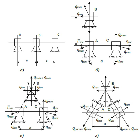 Задание №2 Определить наибольшие результирующие и изгибающие электродинамические нагрузки при трехфазном КЗ, действующие на шины, расположенные в одной плоскости (рисунок 2.1а), а также по вершинам прямоугольного равнобедренного треугольника (рисунок 2.1б) и равностороннего треугольника (рисунок 2.1в). Расстояние между шинами (во всех конструкциях) а м, ударный ток КЗ 𝑖уд. кА. Исходные данные для выполнения задания №2 выбираются по указанию преподавателя из таблицы 2.2 Таблица 2.2 – Варианты для задания №2