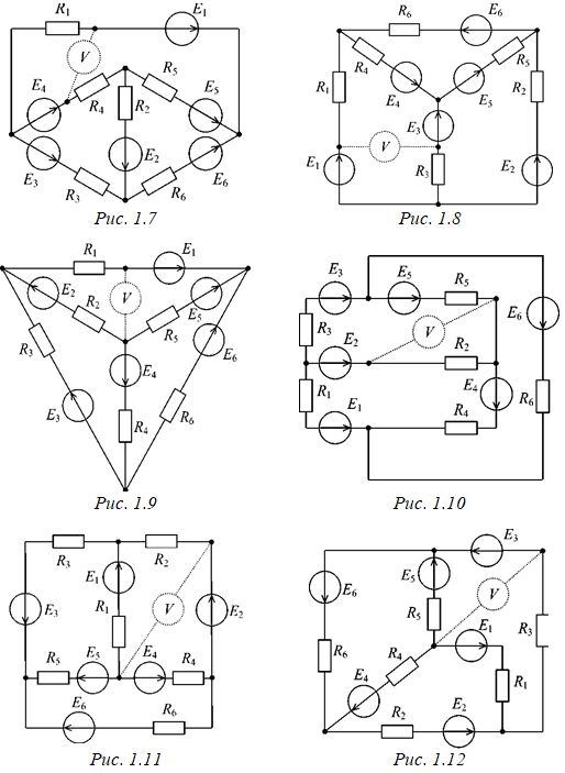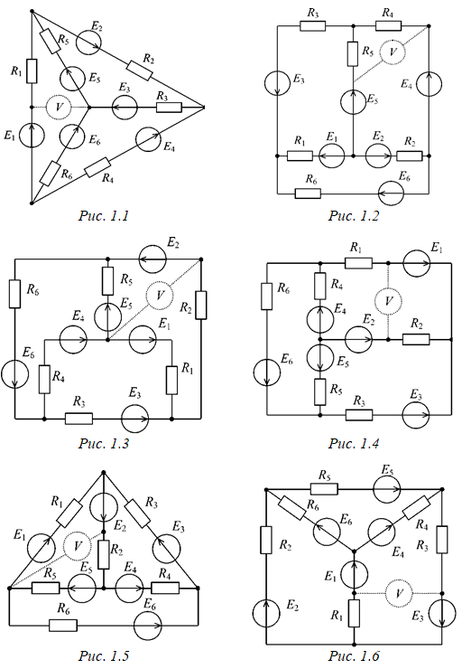 Расчетно-графическая работа №1 РАСЧЕТ ЛИНЕЙНОЙ ЭЛЕКТРИЧЕСКОЙ ЦЕПИ ПОСТОЯННОГО ТОКА Задание Для заданной схемы (рис.1.1 - 1.28) требуется: 1. Определить токи в ветвях одним из нижеперечисленных методов: 1.1) методом непосредственного применения законов Ома и Кирхгофа; 1.2) методом контурных токов; 1.3) методом узловых потенциалов; 1.4) методом наложения (суперпозиции); 2. Выполнить проверку достоверности полученных результатов. 3. Выполнить расчет баланса мощностей; 4. Определить показания вольтметра; Параметры Ri, Ei выдаются преподавателем каждому студенту индивидуально, в соответствии с номером варианта задания из табл.1.1 и 1.2. Номер схемы соответствует номеру варианта задания, который соответствует номеру записи фамилии студента в журнале группы. Таблица 1.1