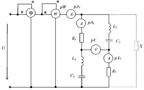 Рис. 2.1 Исходная схема однофазной цепи переменного тока Действующее напряжение и частота источника переменного тока, параметры приемников электрической энергии выдаются преподавателем каждому студенту индивидуально из табл. 2.1 и 2.2. Таблица 2.1